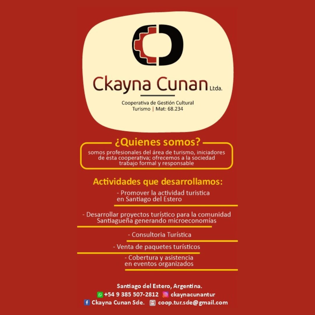 Somos Ckayna Cunan, "Ayer y hoy", una cooperativa de gestión cultural y de turismo. La conformamos técnicos, licenciados y estudiantes avanzados de la carrera de turismo y afines, de la provincia de Santiago del Estero, Argentina